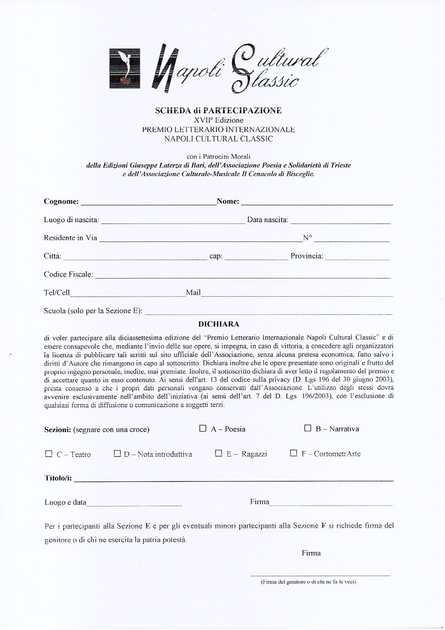 - Il Premio è rivolto, per le Sezioni A, B, C, D ed F ad autori maggiorenni.